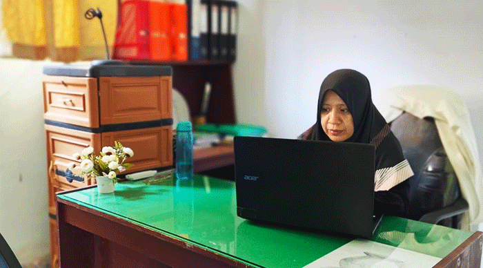 Beberapa siswa melakukan Uji Laporan yang didampingi Team penguji pada Ruang Baca perpustakaan mengunakan Media Belajar