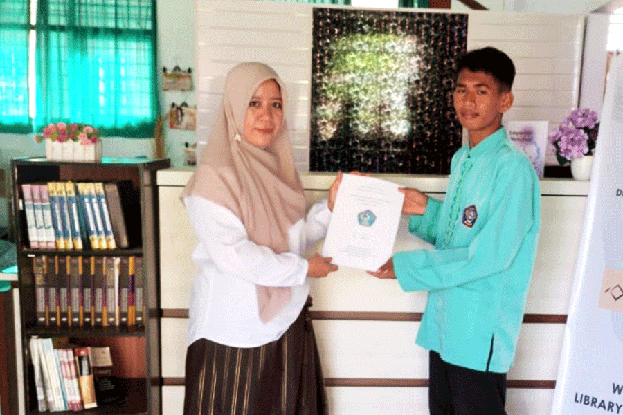 Salah satu siswa menyerahkan secara simbolis Laporan Prakerin Kepada Kepala perpustakaan untuk diArsipkan
